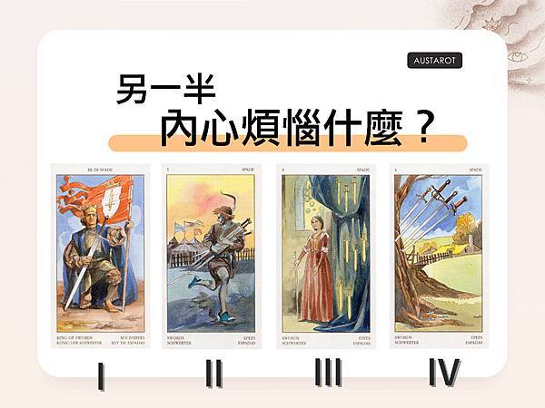選擇到這組牌的朋友,奧斯老師要問問你最近有沒有聽到另一半針對工作起上什麼抱怨或是對工作的疑問呢?因為這樣的牌組多半代表的是工作目標或是工作狀況存在,因此多少可以發現另一半最近對於工作上的無力感甚至是遭躁感會比較高一點。奧斯老師會建議接下來的這段時間,如果另一半有跟你抱怨工作上的事務或是主管,可能要多花點心思聽一下或是給予對方一些建議,可以稍稍分憂下對方在工作上所感受到的壓力。當然實際上要在工作上給予對方實質幫助是困難的,畢竟不在同一個職場工作,但奧斯老師會建議你可以協助分析一下工作上的問題或是聽對方抱怨宣洩一下工作壓力喔。