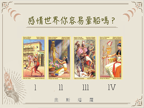 選擇到這組牌的朋友,奧斯老師要說你在感情世界中最沒辦法抵擋的就是噓寒問暖,你的暈船指數高達90%,為什麼呢?因為這樣的牌組多半代表的是關心與在意,所以可以發現很多時候你在認識對象時,不會先有太多的先入為主想法會覺得就先相處看看再說,但如果在互動過程當中這對象對你噓寒問暖或是相當關心你的生活,但也不會太去打擾你和朋友的相處甚至是私人空間時,你就會開始注意起這對象,如果今天你在遇到事情或問題時,這對象如果也是跑第一的給你協助,你就會因此感到挺高的安心感與被照顧的感覺,就會因此對這對象暈船起來喔。