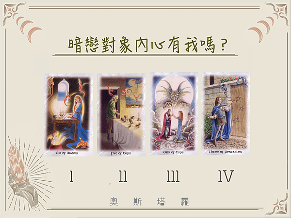 選擇到這組牌的朋友,奧斯老師要說這對象目前好像還沒有注意到你們之間的關係或是你對他的好感喔,因此也就沒有太多情感發展的緣分。因為這樣的牌組多半代表的是互動與平淡,因此可以看得出來雖然這對象即使在現實當中和你有些互動或是也知道你的存在,但這樣的接觸與相處,似乎沒有到情感階段與對你萌芽感情的想法喔。所以挑選到這組牌的朋友,奧斯老師建議你要再觀望看看,不要有太多的行為動作出現,以免嚇到暗戀對象,最後導致關係還沒開始發展就讓關係呈現尷尬與疏遠的狀況喔。