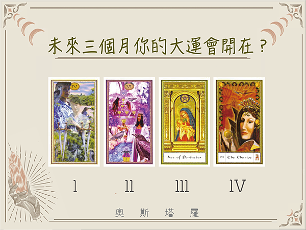 選擇到這組牌的朋友,奧斯老師要說下來的做運勢可就挺旺的囉!這樣的牌組多半代表的意志力與成功,所以你會發現在接下來的工作上自己都挺能夠解決許多工作上的問題!對於工作的掌握度及目標都挺明確的!只是奧斯老師要提醒你接下來的工作上,主管將會指派你新的工作任務!但別擔心,這樣的牌組也多半顯示你能將工作做得盡善盡美,有機會在主管之間獲得更好的評價,也讓主管對你的想法更加良好!所以接下來在工作上可要好好的表現自己不要害怕新工作的交接!好好地接,努力表現囉!