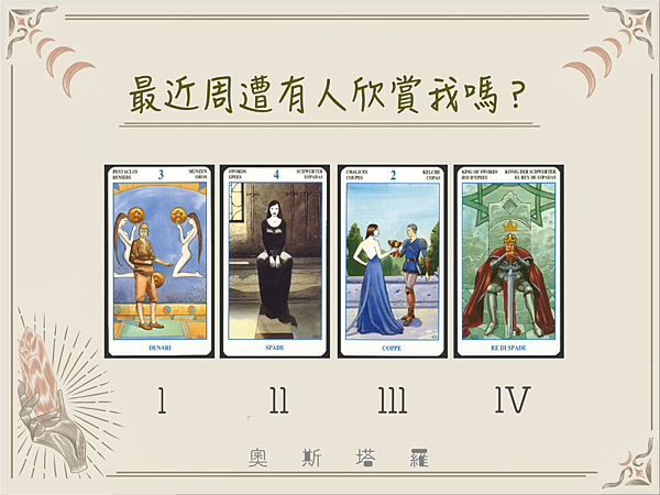 選擇到這組牌的朋友,奧斯老師要說你目前生活周遭就比較沒有所謂欣賞你的人存在囉。因為這樣的牌組多半代表的是朋友關係與相處,似乎比較沒有帶多的情感投射在裡頭,如果對於想要發展情感的朋友挑到這組牌,可能就比較差強人意了。不過話雖如此,但這樣的牌組還是挺正向的。因此目前生活周遭即使沒有對你有情感投射的人,但整體上都還是對你感到挺信賴且和你相處互動時,也對你挺正面評價的人喔。所以即使情感層面或許不太明顯,但是關係互動層面可說是還不錯,因此奧斯老師還是建議你要繼續和目前生活周遭的朋友們好好互動囉。