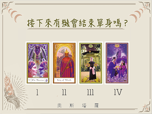 選擇到這組牌的朋友,若想要結束單身,就比較差強人意囉!畢竟這樣的牌組多半代表的還是原地不動以其不易改變!所以真要改變單身的身分,看起來機會並不高!不過也沒關係,因為這樣的牌組多半代表的是財運機會,因此或許在愛情方面是比較失意的!但在職場或是在財運方面,狀況還不錯!所以奧斯建議選到這組牌的朋友,戀愛運勢較低迷的狀態之下,不如就將這樣的注意力轉移到工作事業方面!將有機會為你帶來還不錯的發展以及金錢狀況唷!