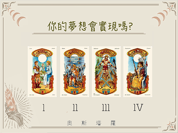 選擇到這組牌的朋友,奧斯老師要問問!你多久沒有努力邁步自己的夢想了呢?這樣的牌組多半代表環境的問題及社會的現實!當然你不是個沒夢想的人!你也有許多的夢想及目標,但偏偏在現實當中磨耗了許多你對於夢想的堅持!漸漸地你也就委曲求全了這樣的現實環境!奧斯要說,有時候屈就現實不是壞事,但面對夢想的堅持也挺重要!回過頭不要後悔了自己的人生每一步!年輕不怕跌倒,怕就怕你不肯跨出也害怕受傷!奧斯老師常說年輕就是本錢,倒不如跌倒再努力一次!所以請嘗試回想你的夢想,.努力再拚上一次吧!