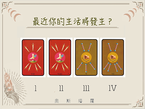 選擇到這組牌的朋友,奧斯可就要跟你說聲恭喜囉!這樣的牌組基本上就是一個晚整的循環與成功,所以接下來的運勢其實還不錯!若是一直以來有煩心的事情擾的你老脾氣暴躁睡不好覺,這些問題有都逐漸有改善了!而如果像是最近面臨到瓶頸或是問題懸著總無法解決的朋友!這些狀況也都開始逐漸的往好的方向進行囉!當然,奧斯這樣的牌不是告訴你不用努力了,而是一切狀況都將往好的方向進行,所以該做的事情都還得繼續加油!可不要看完了奧斯老師的占卜,就什麼努力都不做,導致事情狀況更差,那奧斯老師可就冤枉囉!