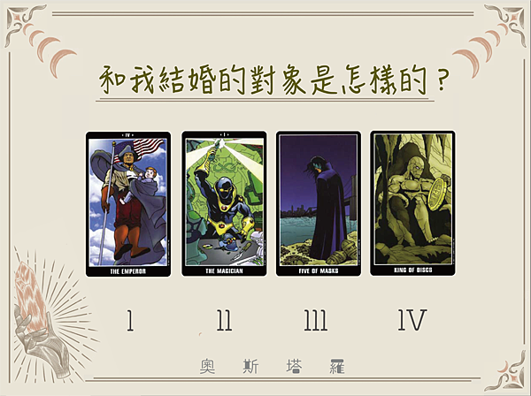 選擇到這組牌的朋友,奧斯老師會說你的婚姻對象會是個「有想法個性又穩定」的對象步入婚姻喔!畢竟這樣的牌組多半代表的是成熟穩重,所以在面對自己的工作或人生,都有自己的想法!不會是那種需要你協助太多或需要你幫忙的對象!當然,目前要是身邊有對象的朋友!挑選到這組牌,覺得上述和另一半的個性有落差的!也不要太緊張唷!畢竟人的個性都在變化,好好的和另一半相處!或是在步入婚姻時,對象的個性就和上面形容的相似囉!而單身的朋友,奧斯老師也會建議你多觀察上述條件的對象,接著和對象好好的相處跟經營關係囉!